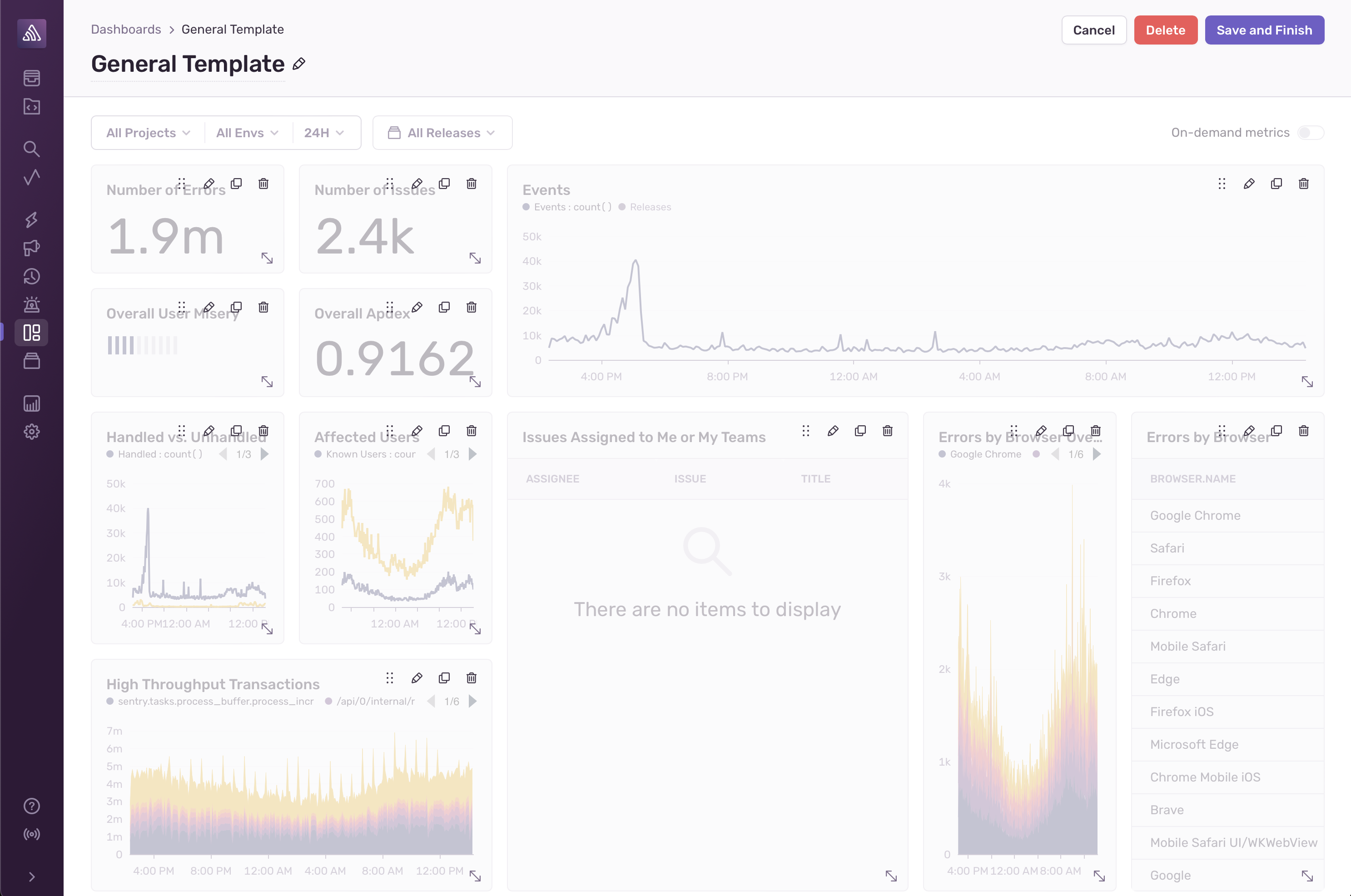 When adding a widget or editing an existing one, you will be taken to a new page where you can see the dashboard widget builder. The widget builder has several configuration options that you can use to shape data and add information to your dashboard. Learn more in the Widget Builder documentation.